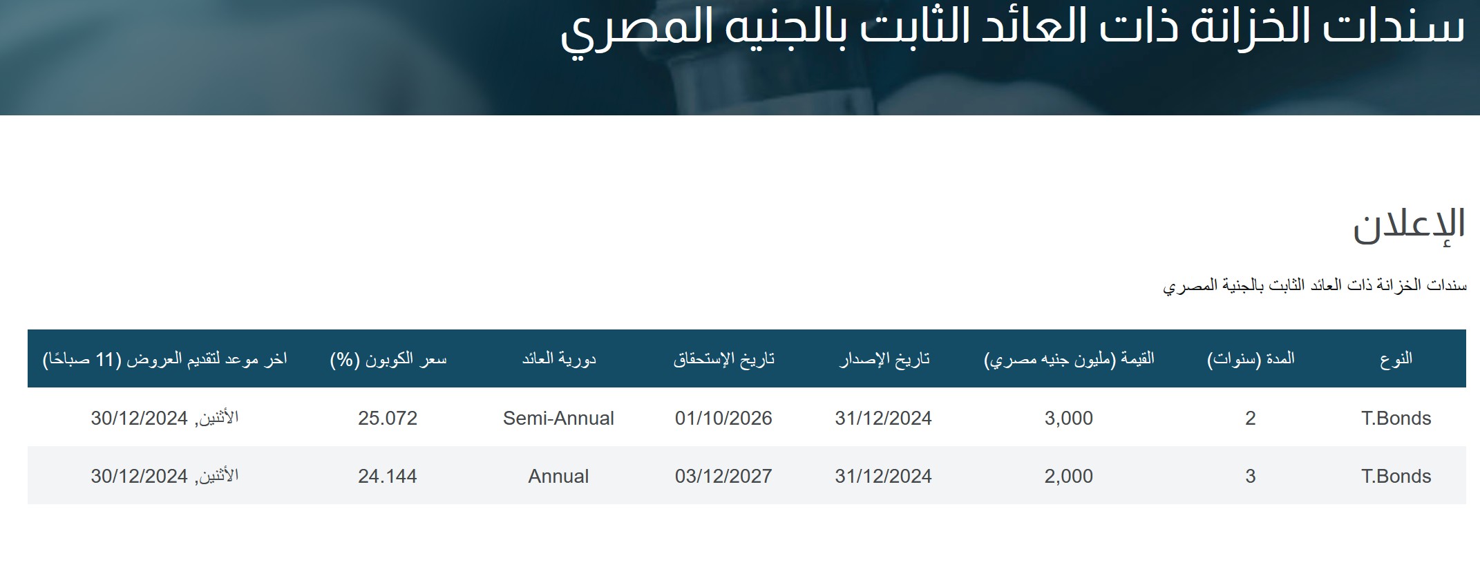 ووفقًا لما هو منشور عبر الموقع الرسمي للبنك، فإن أخر موعد لتقديم العروض يوم 30 ديسمبر الجاري، وسعر الكوبون 25.072% لسندات الخزانة لمدة عامين، بقيمة 3 مليارات جنيه، بينما سعره 24.144% لسندات الخزانة لمدة 3 سنوات، بقيمة مليارين جنيه.