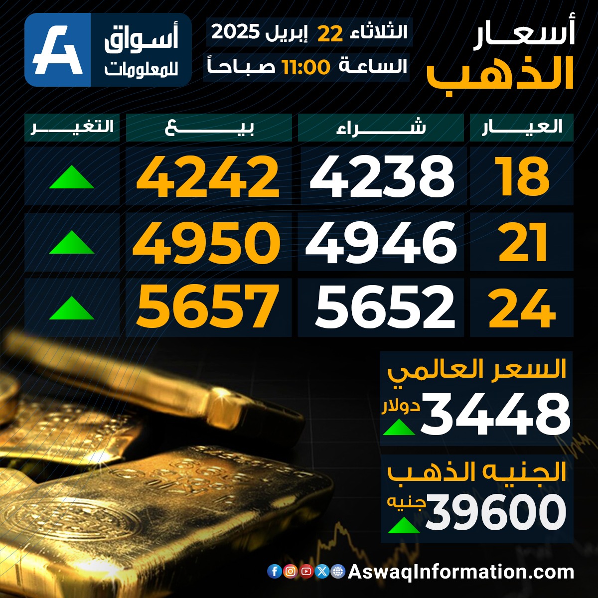 سجل سعر الجنيه الذهب اليوم الثلاثاء 22 إبريل 2025 ارتفاعًا عند 39.600 جنيهًا ، قبل إضافة المصنعية والضريبة والدمغة.