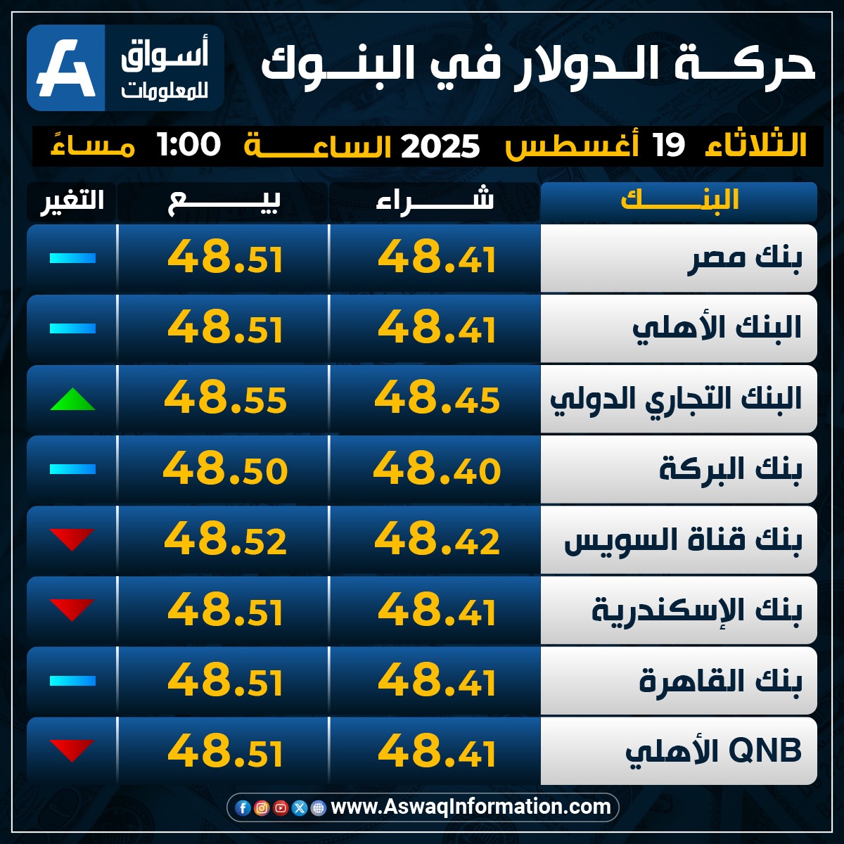 سعر الدولار اليوم.. ننشر لكم التفاصيل التي طرأت على العملة الخضراء التي شهدت تباينًا بمنتصف تعاملات الثلاثاء 19-8-2025 مقابل الجنيه، وذلك بحسب شاشات التداول المعلنة بالبنوك الحكومية والخاصة العاملة داخل السوق المصرفية.