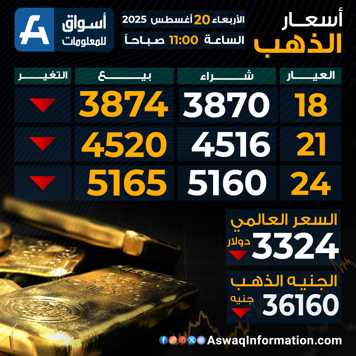 سجل سعر الجنيه الذهب اليوم الأربعاء 20 أغسطس 2025 تراجعًا عند 36,160 جنيهًا ، قبل إضافة المصنعية والضريبة والدمغة.