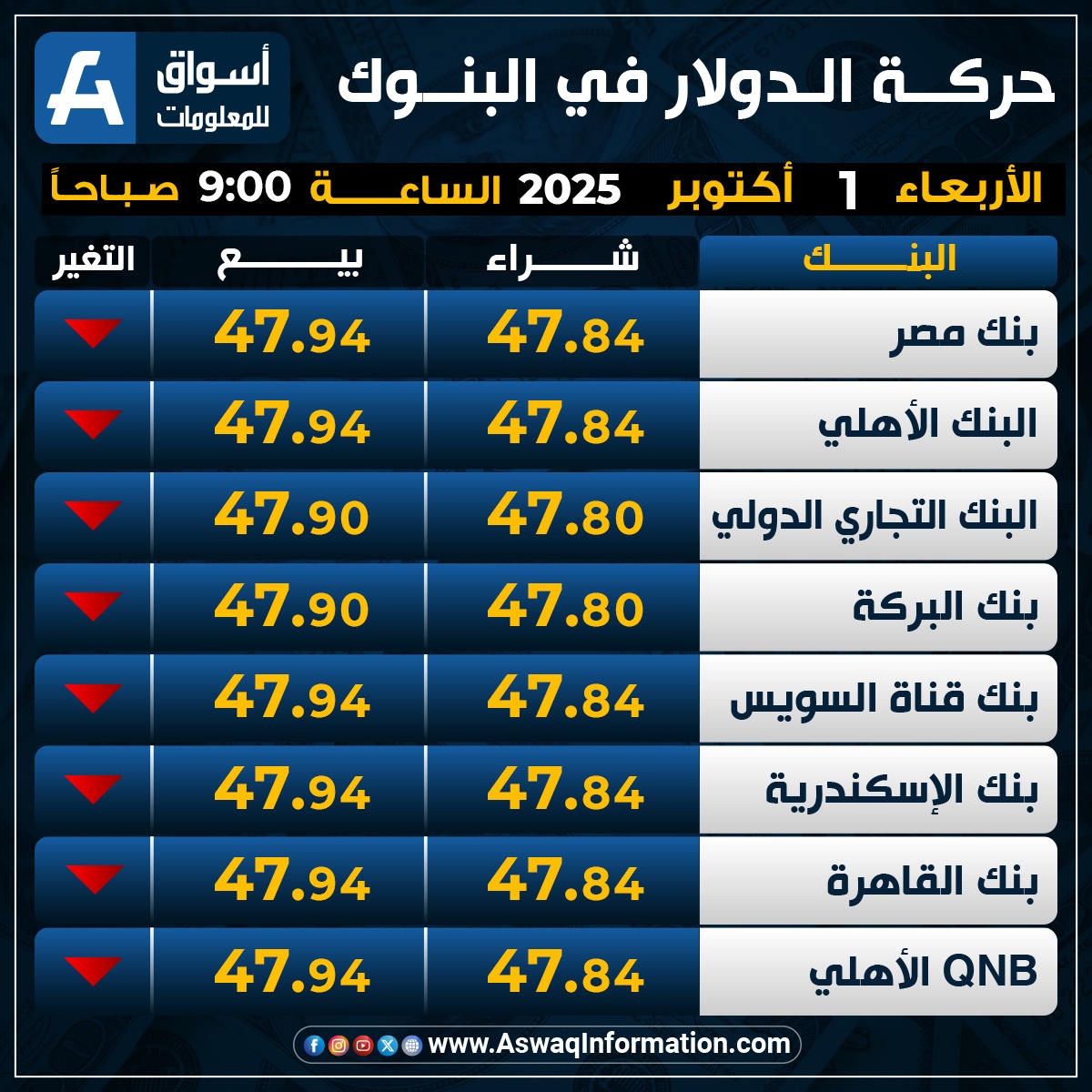وهبط سعر الدولار في البنك الأهلي المصري مقابل الجنيه المصري عند 47.84 جنيه للشراء، ونحو 47.94 جنيه للبيع.