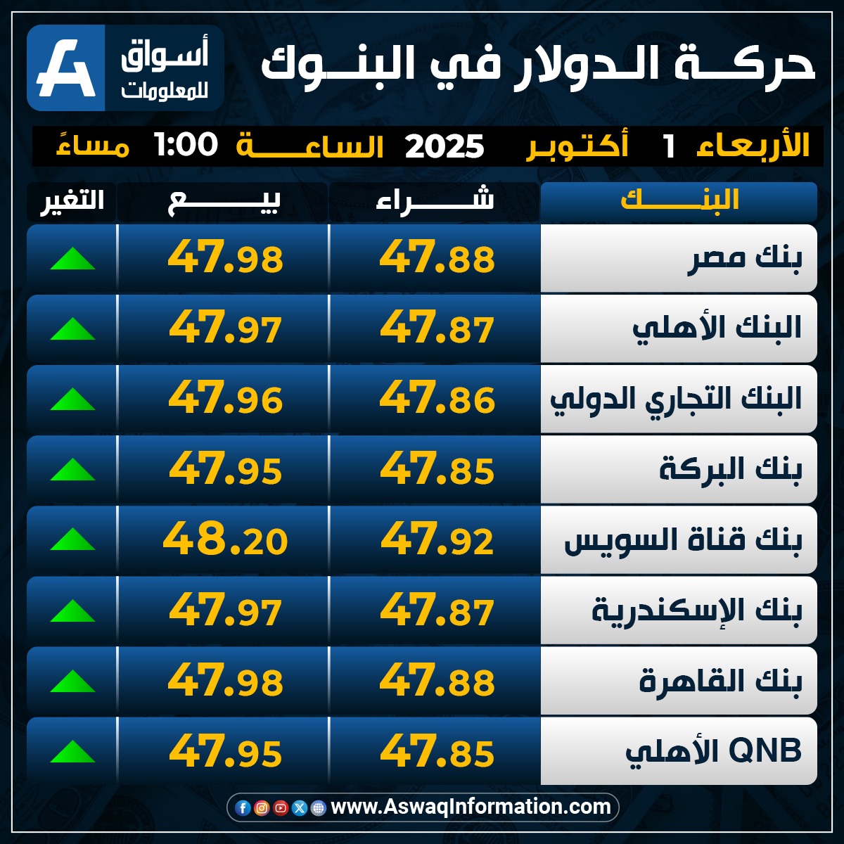 وارتفع سعر الدولار في بنك QNB الأهلي مقابل الجنيه المصري عند 47.85 جنيه للشراء، ونحو 47.95 جنيه للبيع.