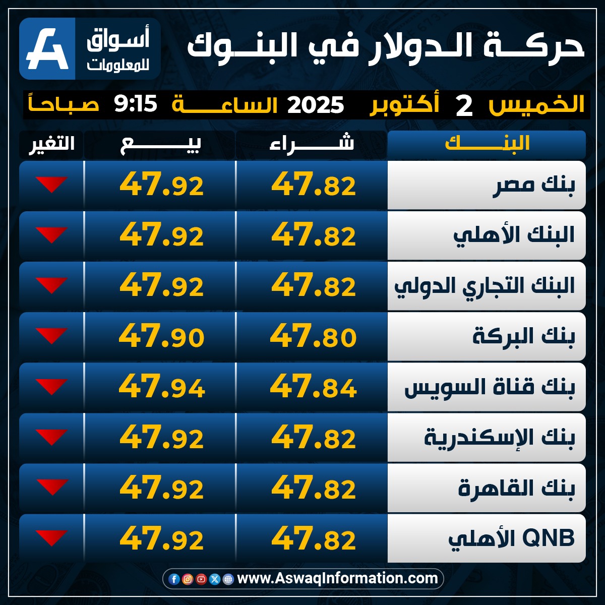 وانخفض سعر الدولار في بنك QNB الأهلي مقابل الجنيه المصري عند 47.82 جنيه للشراء، ونحو 47.92 جنيه للبيع.