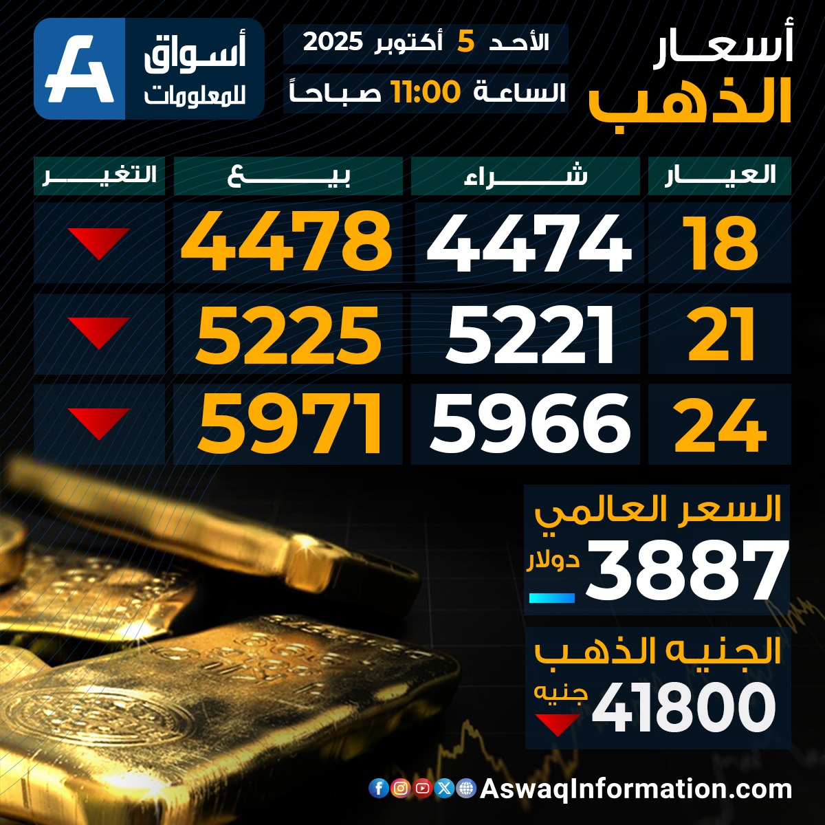 سجل سعر الجنيه الذهب اليوم الأحد 5 أكتوبر 2025 تراجعًا عند 41,800 جنيهًا ، قبل إضافة المصنعية والضريبة والدمغة.