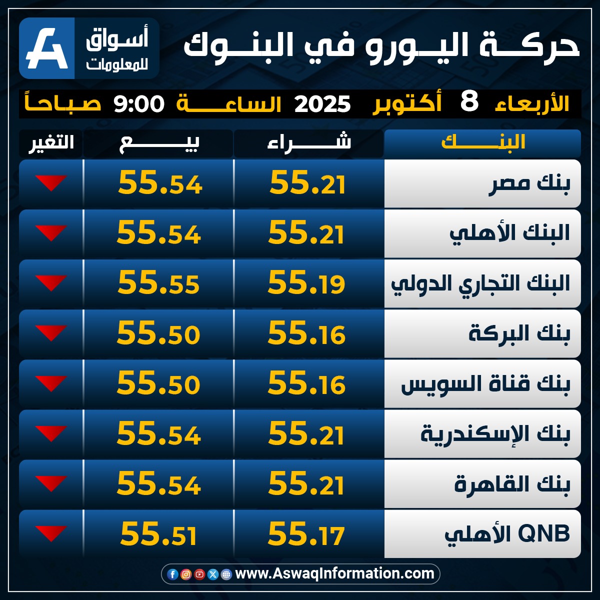 وانخفض سعر اليورو في البنك عند 55.16 جنيه للشراء، وسعر 55.50 جنيه للبيع