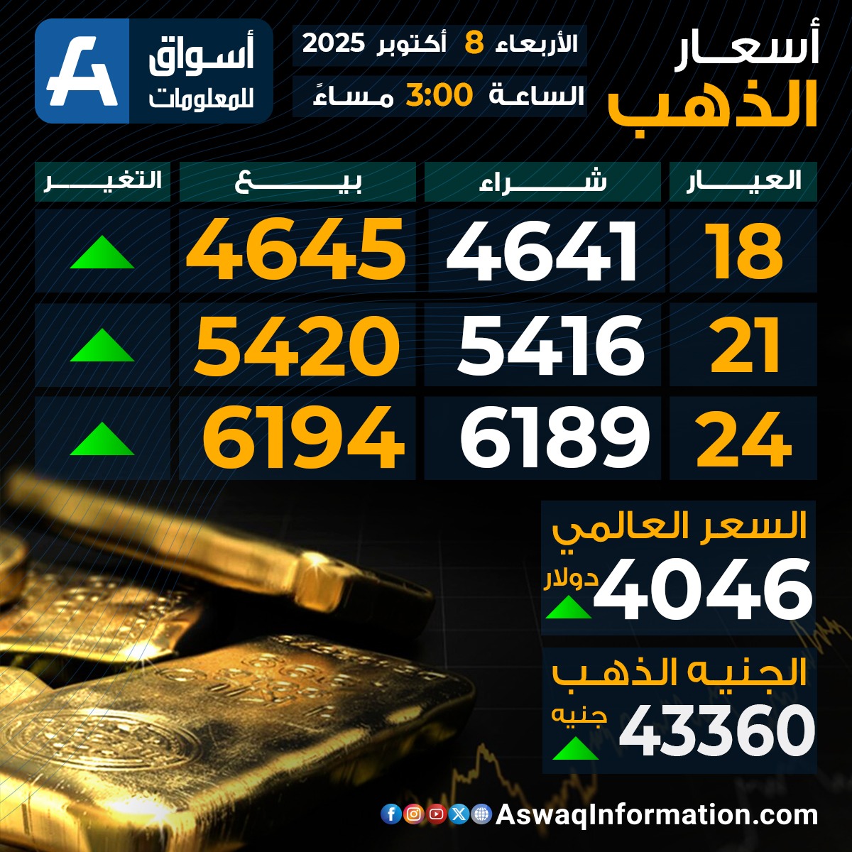 كما سجل سعر الذهب العالمي اليوم ارتفاعًا عند 4046 دولار.