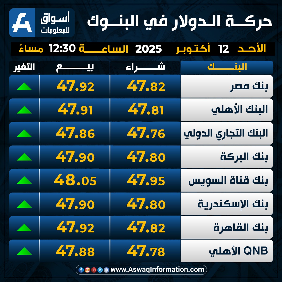 سعر الدولار اليوم.. ننشر لكم التفاصيل التي طرأت على العملة الخضراء التي شهدت ارتفاعًا بمنتصف التعاملات الأحد 12 اكتوبر 2025 مقابل الجنيه، وذلك بحسب شاشات التداول المعلنة بالبنوك الحكومية والخاصة العاملة داخل السوق المصرفية.