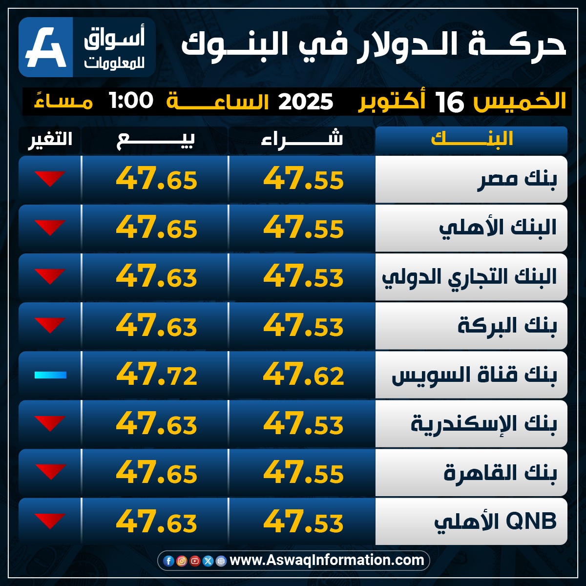 وانخفض سعر الدولار في بنك QNB الأهلي مقابل الجنيه المصري عند 47.53 جنيه للشراء، ونحو 47.63 جنيه للبيع.