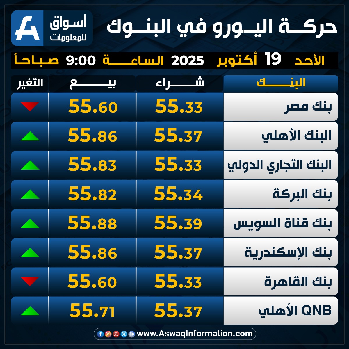 بينما صعد سعر اليورو في البنك الأهلي المصري نحو 55.37 جنيه للشراء، وسعر 55.86 جنيه للبيع