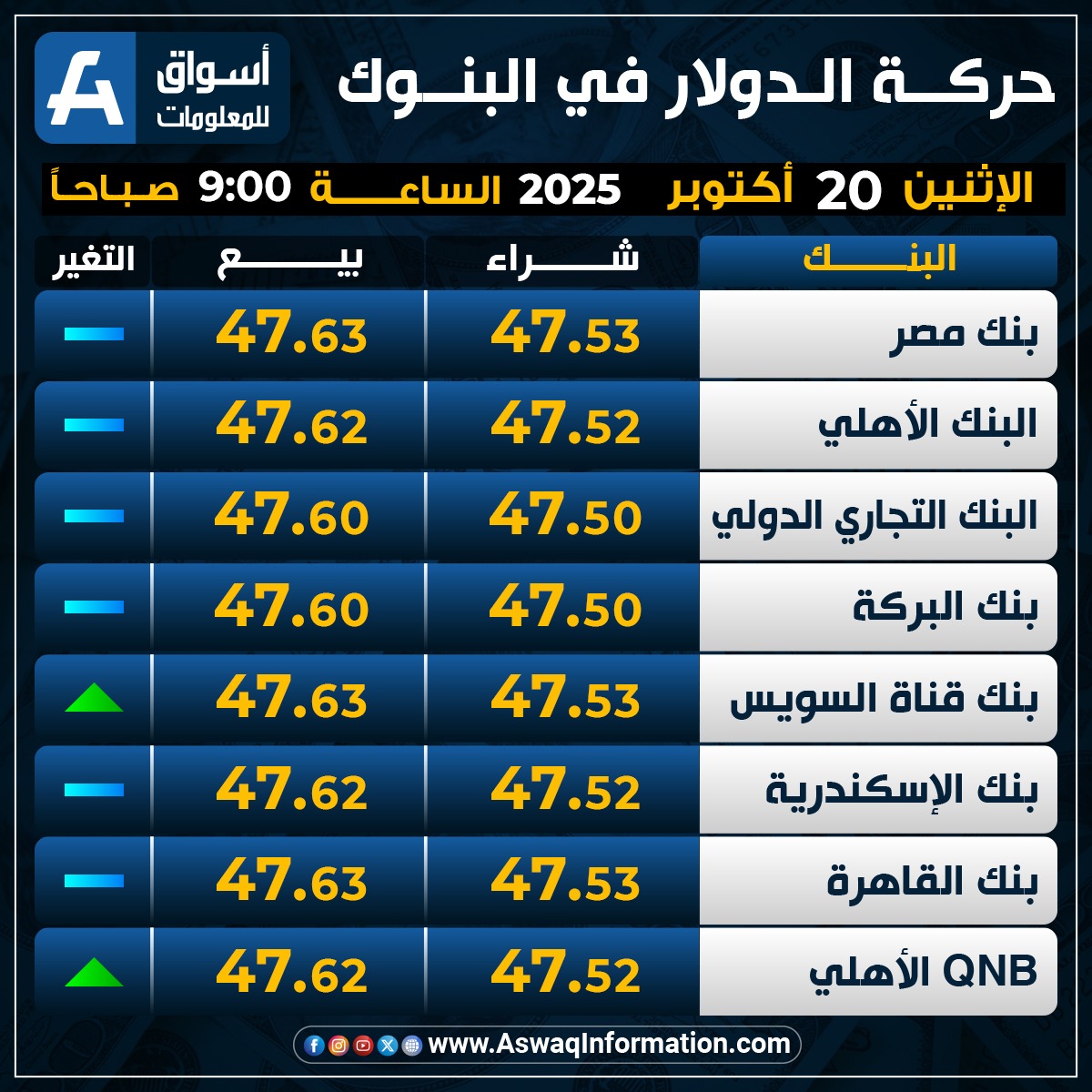 سعر الدولار اليوم.. ننشر لكم التفاصيل التي طرأت على العملة الخضراء التي شهدت تباينًا بمستهل تعاملات بمستهل الإثنين 20 اكتوبر 2025 مقابل الجنيه، وذلك بحسب شاشات التداول المعلنة بالبنوك الحكومية والخاصة العاملة داخل السوق المصرفية.