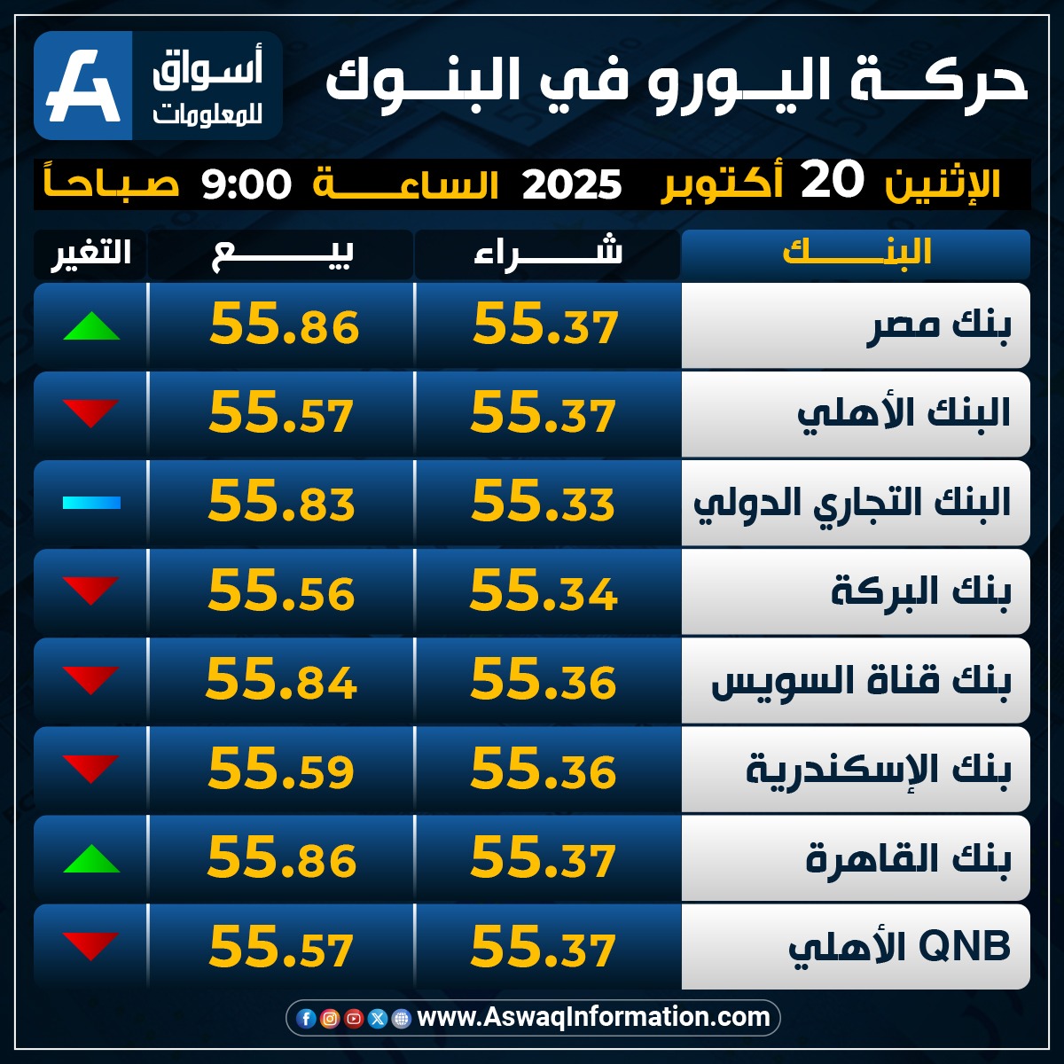 ارتفع سعر اليورو في بنك مصر نحو 55.37 جنيه للشراء، وسعر 55.86 جنيه للبيع