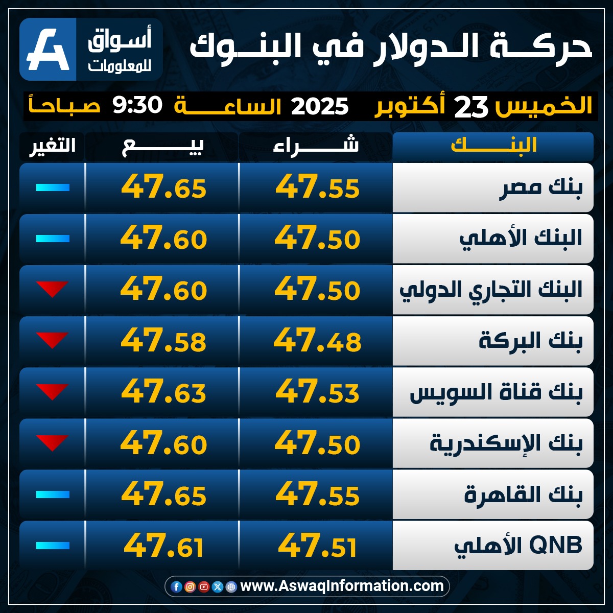 وثبت سعر الدولار في البنك الأهلي المصري مقابل الجنيه المصري عند 47.50 جنيه للشراء، ونحو 47.60 جنيه للبيع.
