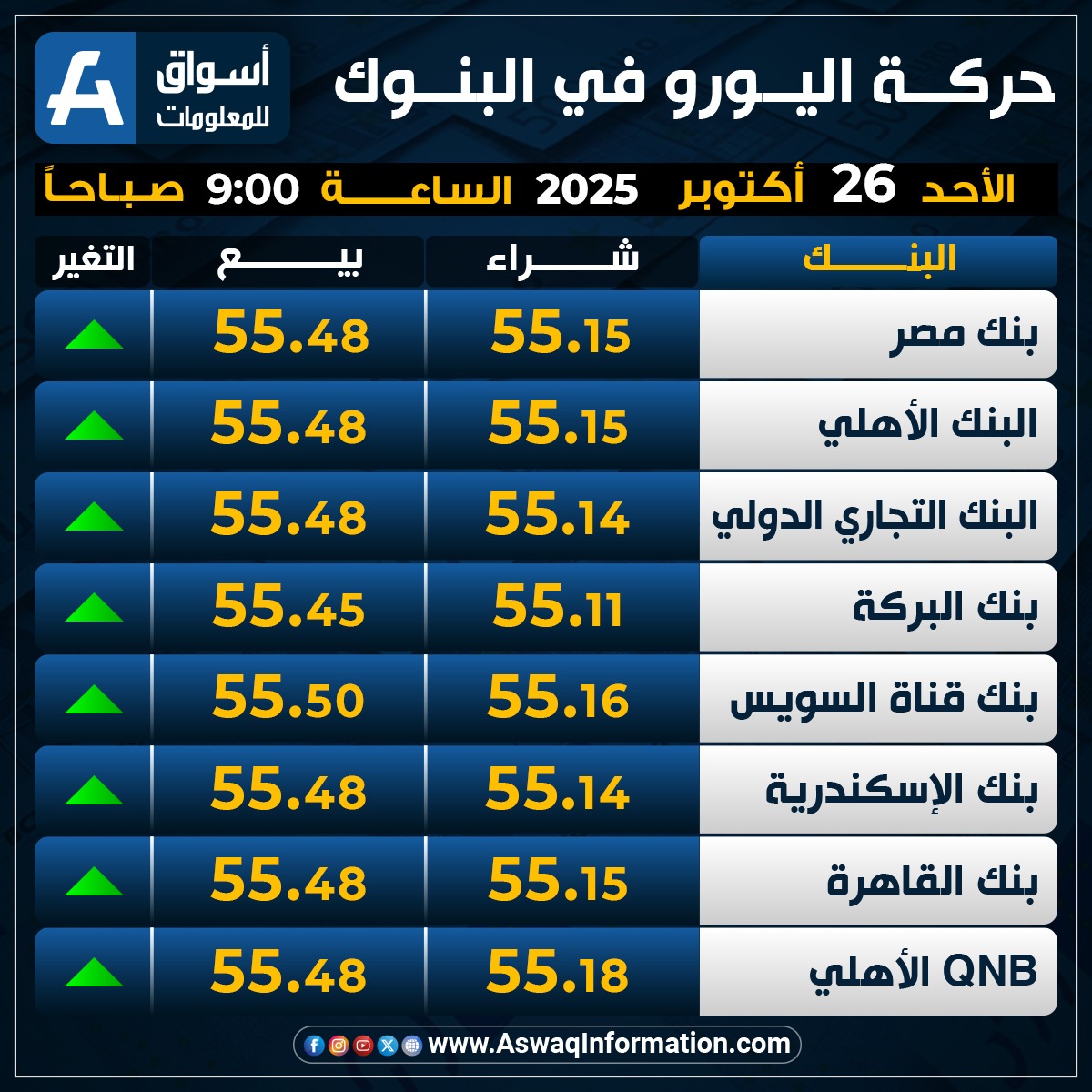 وصعد سعر اليورو في البنك الأهلي المصري نحو 55.15 جنيه للشراء، وسعر 55.48 جنيه للبيع