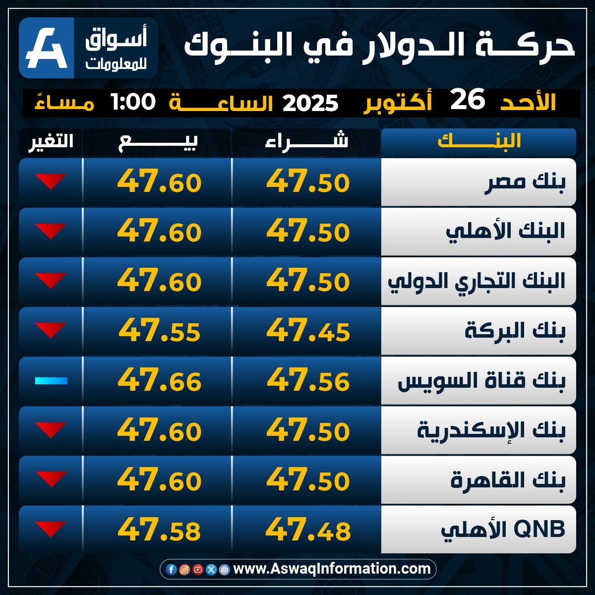 وهبط سعر الدولار في البنك الأهلي المصري مقابل الجنيه المصري عند 47.50 جنيه للشراء، ونحو 47.60 جنيه للبيع.