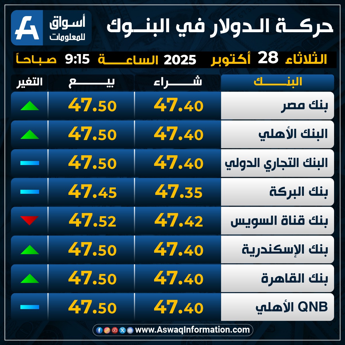 سعر الدولار اليوم.. ننشر لكم التفاصيل التي طرأت على العملة الخضراء التي شهدت تباينًا بمستهل تعاملات اليوم الثلاثاء 28 اكتوبر 2025 مقابل الجنيه، وذلك بحسب شاشات التداول المعلنة بالبنوك الحكومية والخاصة العاملة داخل السوق المصرفية.