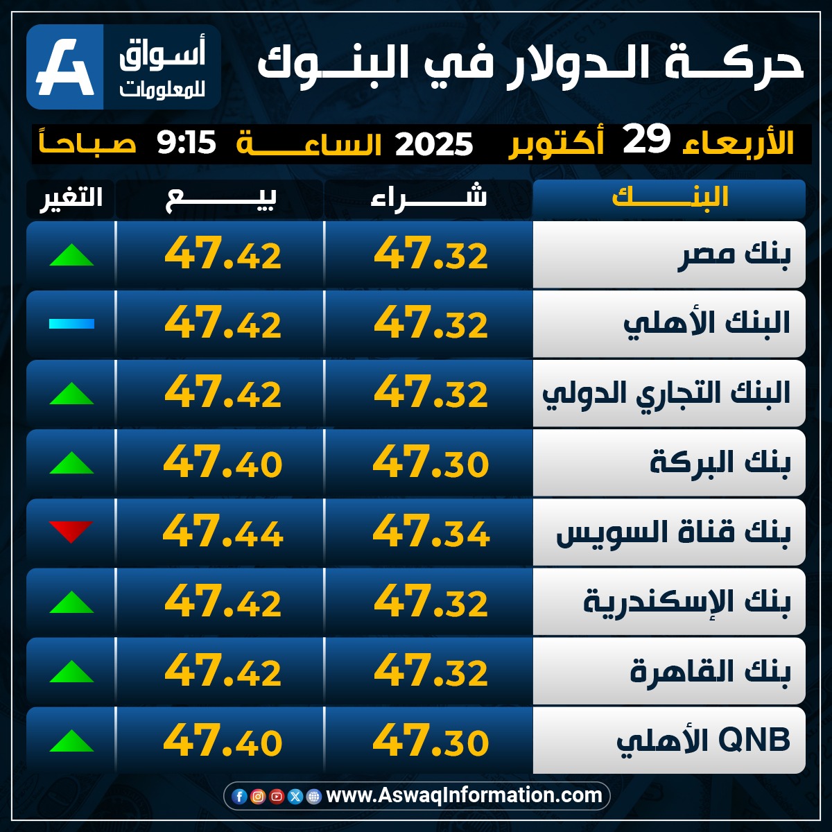 سعر الدولار اليوم.. ننشر لكم التفاصيل التي طرأت على العملة الخضراء التي شهدت ارتفاعًا بمستهل تعاملات اليوم الأربعاء 29 اكتوبر 2025 مقابل الجنيه، وذلك بحسب شاشات التداول المعلنة بالبنوك الحكومية والخاصة العاملة داخل السوق المصرفية.