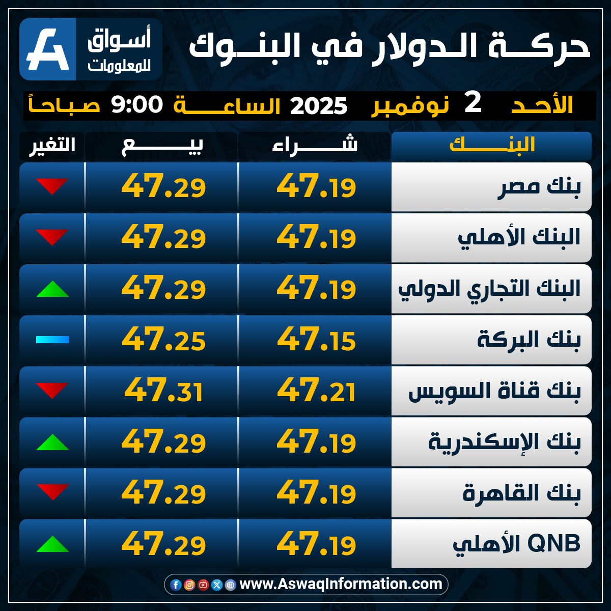 وهبط سعر الدولار في البنك الأهلي المصري مقابل الجنيه المصري عند 47.19 جنيه للشراء، ونحو 47.29 جنيه للبيع.