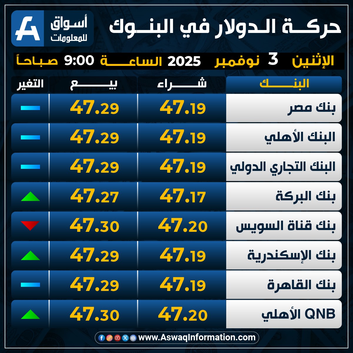 في حين تراجع سعر الدولار في بنك قناة السويس مقابل الجنيه المصري عند 47.20 جنيه للشراء، ونحو 47.30 جنيه للبيع.