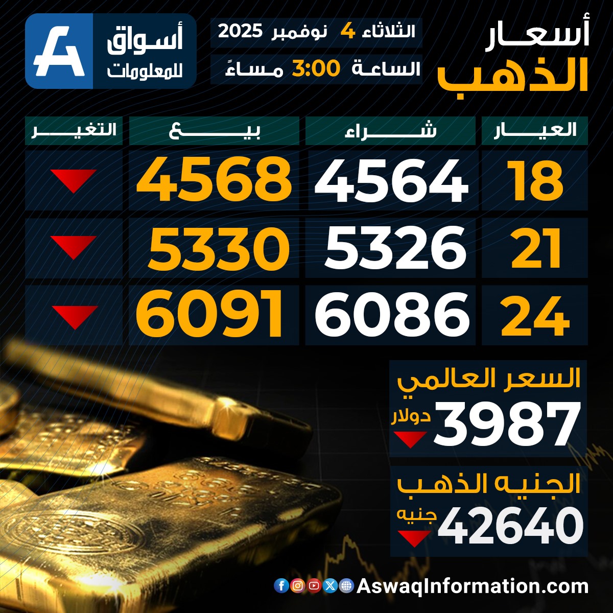سعر الذهب في مصر الثلاثاء 4 نوفمبر 2025