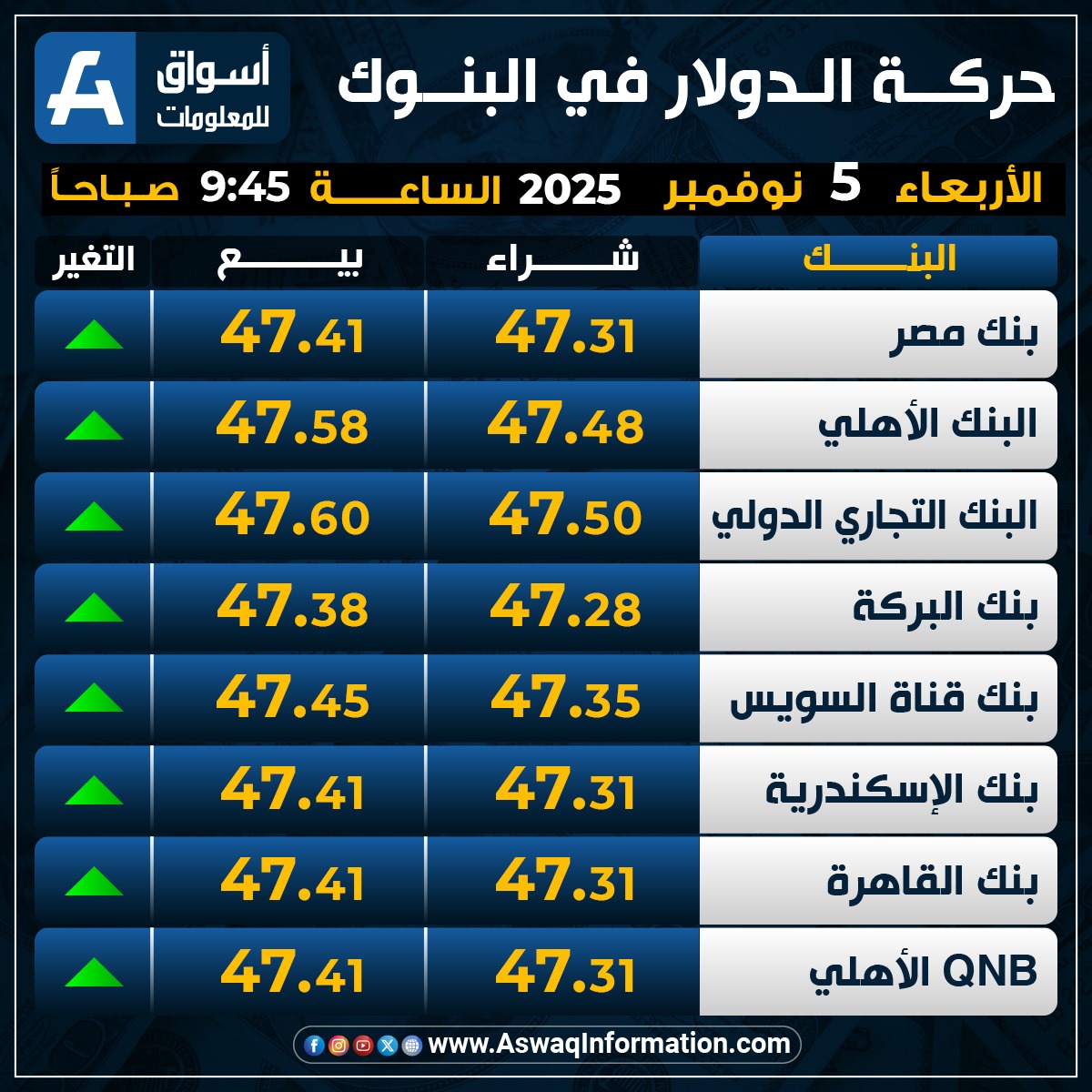 ارتفع سعر الدولار في بنك مصر مقابل الجنيه المصري عند 47.31 جنيه للشراء، ونحو 47.41 جنيه للبيع.