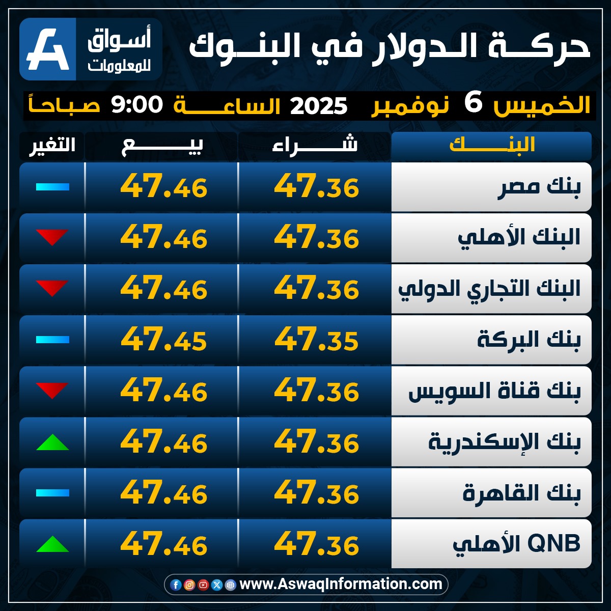 سعر الدولار اليوم.. ننشر لكم التفاصيل التي طرأت على العملة الخضراء التي شهدت تباينًا بمستهل تعاملات اليوم الخميس 6 نوفمبر 2025 مقابل الجنيه، وذلك بحسب شاشات التداول المعلنة بالبنوك الحكومية والخاصة العاملة داخل السوق المصرفية.