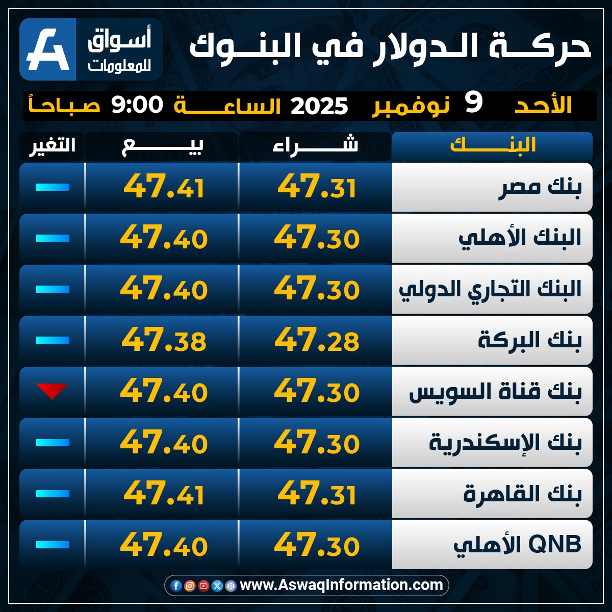 سعر الدولار اليوم.. ننشر لكم التفاصيل التي طرأت على العملة الخضراء التي شهدت استقرارًا بمستهل تعاملات اليوم الأحد 9 نوفمبر 2025 مقابل الجنيه، وذلك بحسب شاشات التداول المعلنة بالبنوك الحكومية والخاصة العاملة داخل السوق المصرفية.