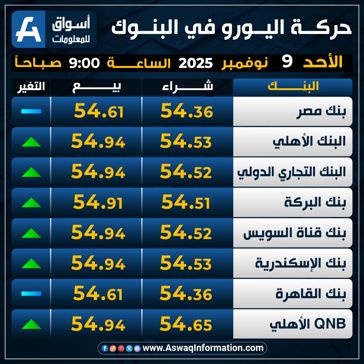 ارتفع سعر اليورو اليوم الأحد 9 نوفمبر 2025 ، بمستوى الصرف مقابل الجنيه في مستهل التعاملات الصباحية بعدد من فروع البنوك المحلية والأجنبية وشركات الصرافة العاملة داخل السوق المحلية.
