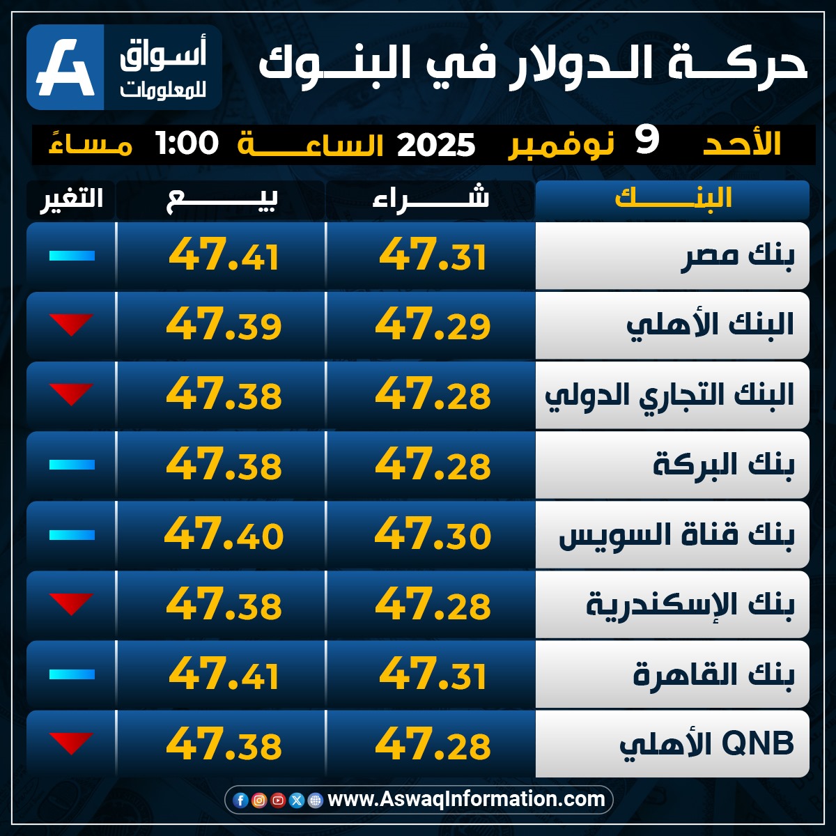 بينما تراجع سعر الدولار في بنك QNB الأهلي مقابل الجنيه المصري عند 47.28 جنيه للشراء، ونحو 47.38 جنيه للبيع.