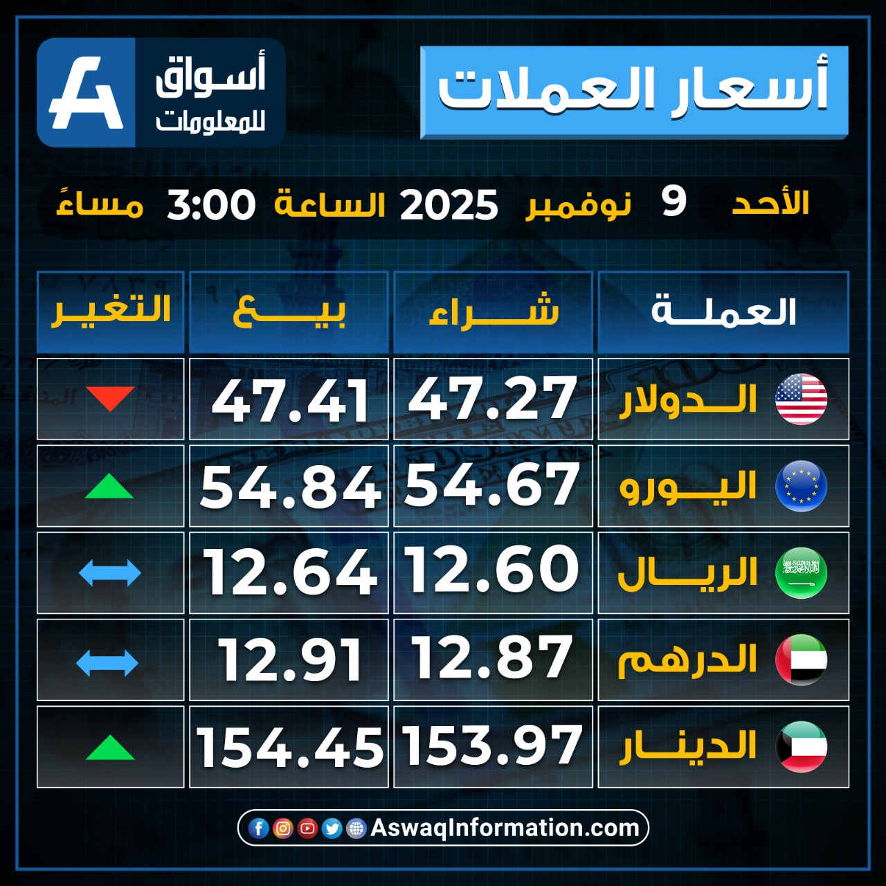 خيم التباين على أسعار العملات اليوم الأحد 9 نوفمبر 2025، مقابل الجنيه في نهاية التعاملات.
