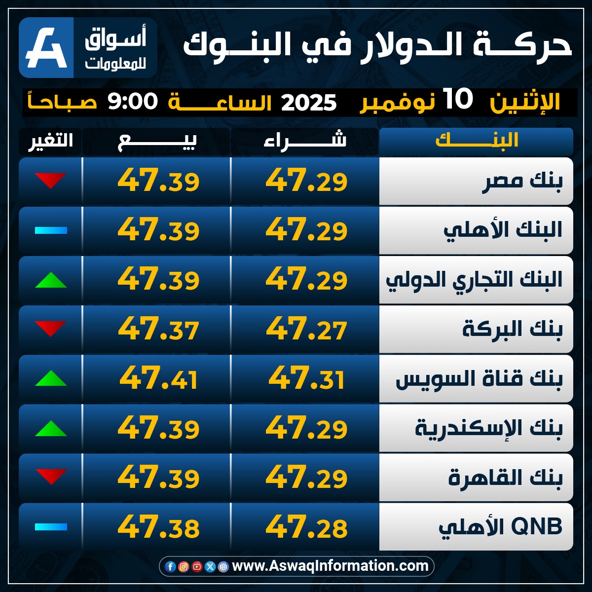 بينما ثبت سعر الدولار في البنك الأهلي المصري مقابل الجنيه المصري عند 47.29 جنيه للشراء، ونحو 47.39 جنيه للبيع.