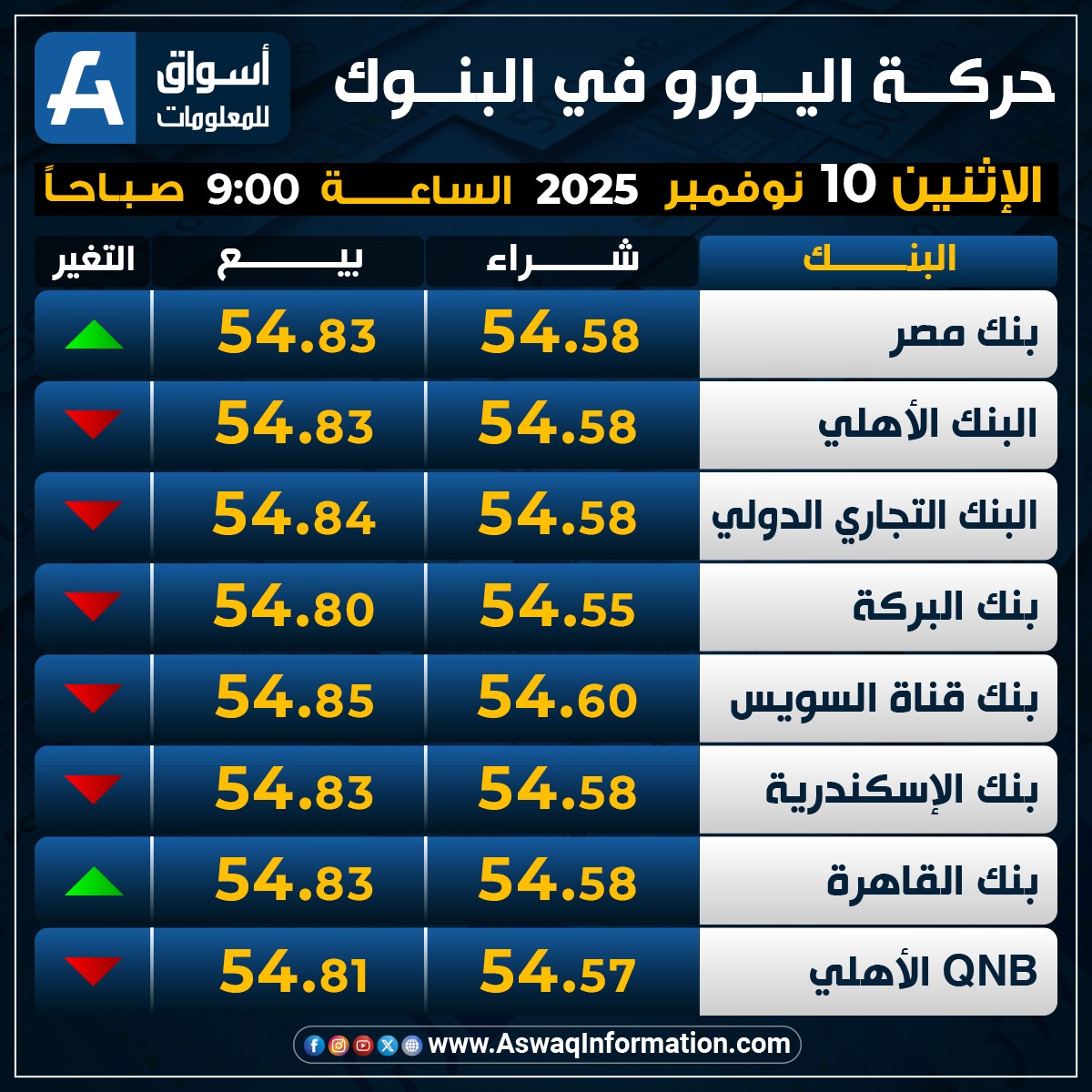 ارتفع سعر اليورو في بنك مصر نحو 54.58 جنيه للشراء، وسعر 54.83 جنيه للبيع
