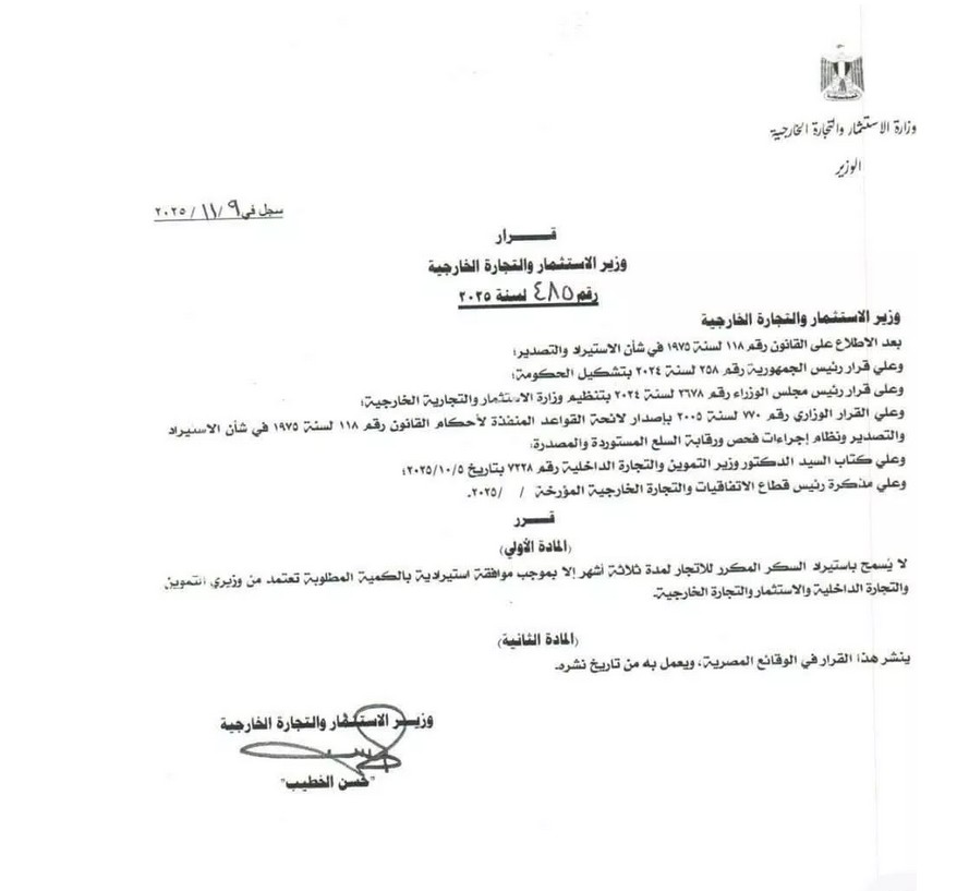 يشار إلى أن أصدر المهندس حسن الخطيب وزير الاستثمار والتجارة الخارجية، أصدر القرار رقم 485 لسنة 2025، بحظر استيراد السكر المُكرر للاتجار لمدة ثلاثة شهور، ويُستثنى الحالات التي تحصل على موافقة استيرادية خاصة تصدر بالاتفاق بين وزيري الاستثمار والتموين.