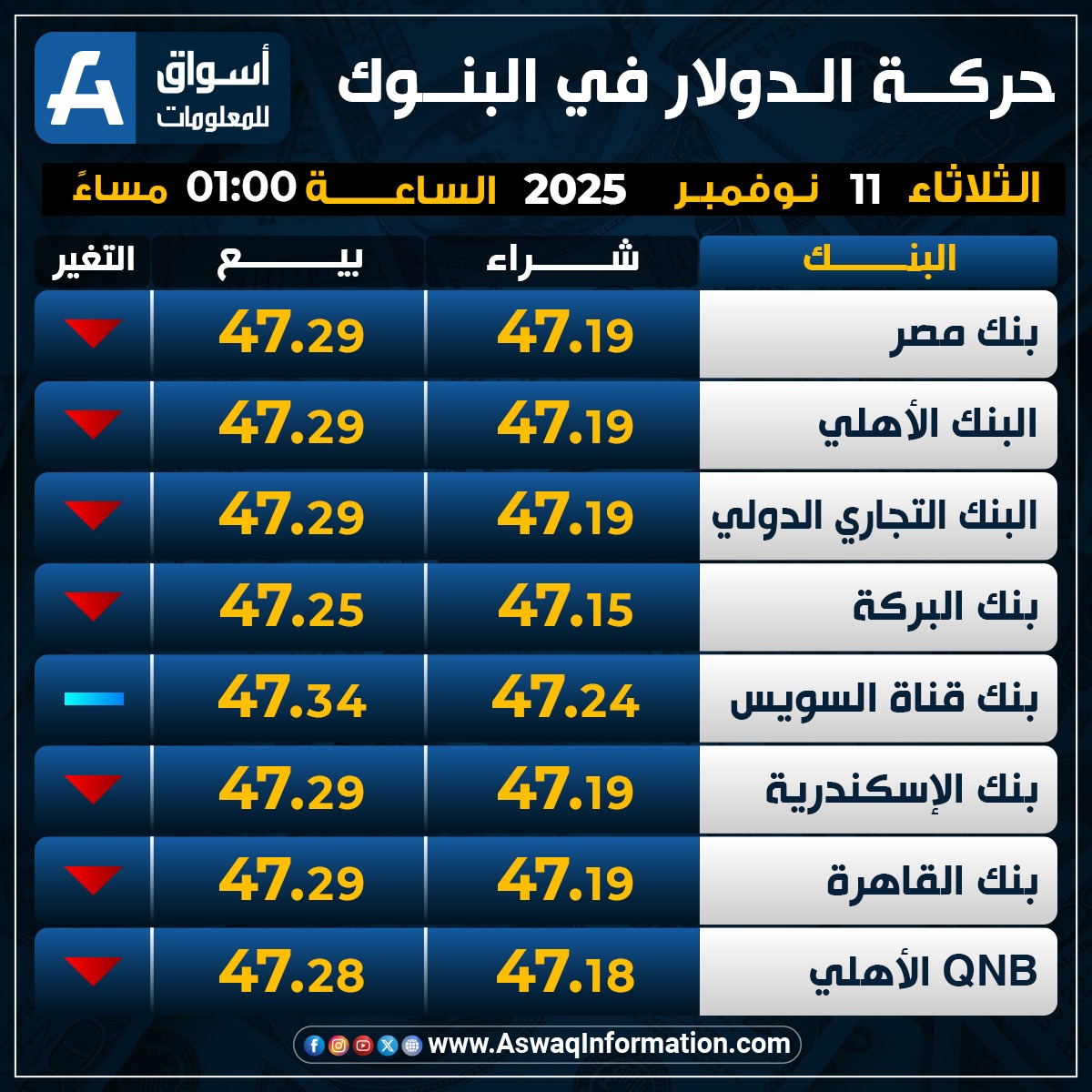 وتراجع سعر الدولار في بنك QNB الأهلي مقابل الجنيه المصري عند 47.18 جنيه للشراء، ونحو 47.28 جنيه للبيع.
