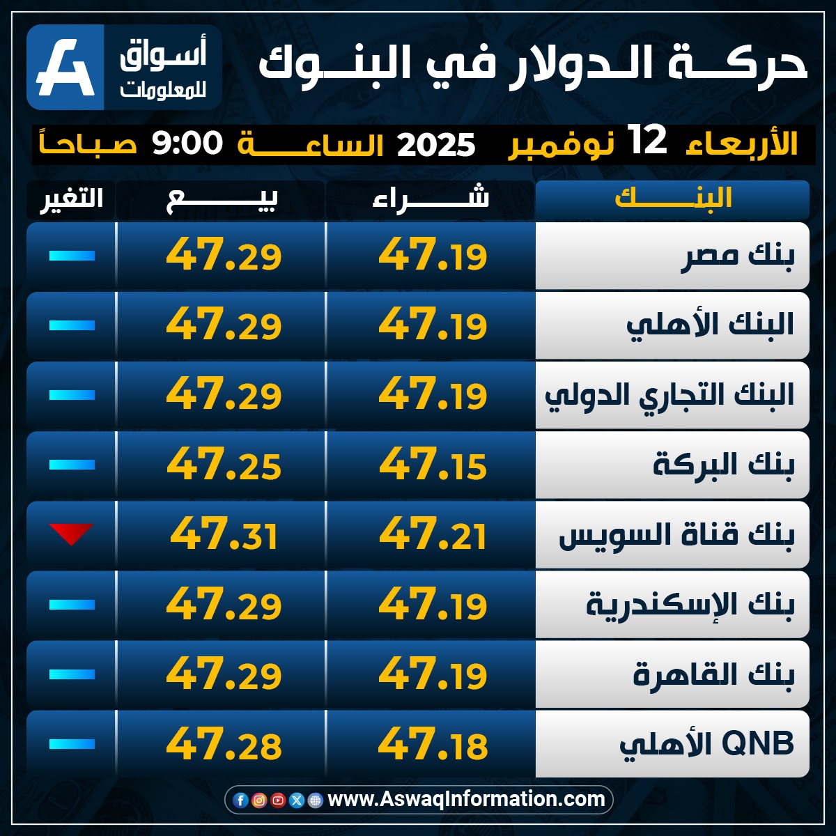 بينما نزل سعر الدولار في بنك قناة السويس مقابل الجنيه المصري عند 47.21 جنيه للشراء، ونحو 47.32 جنيه للبيع.