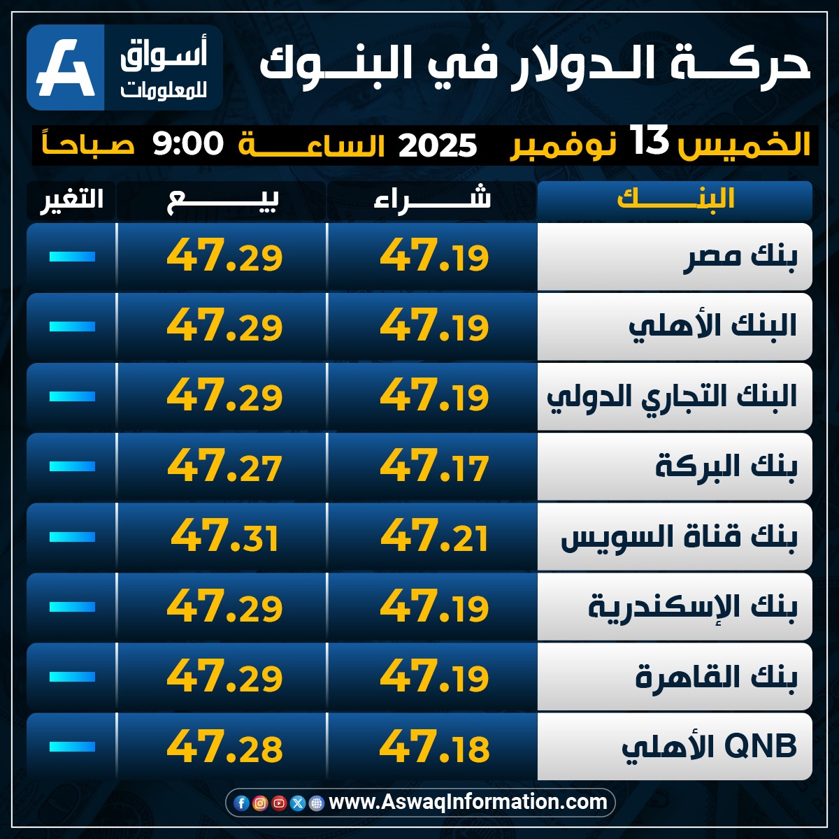وثبت سعر الدولار في بنك قناة السويس مقابل الجنيه المصري عند 47.21 جنيه للشراء، ونحو 47.32 جنيه للبيع.