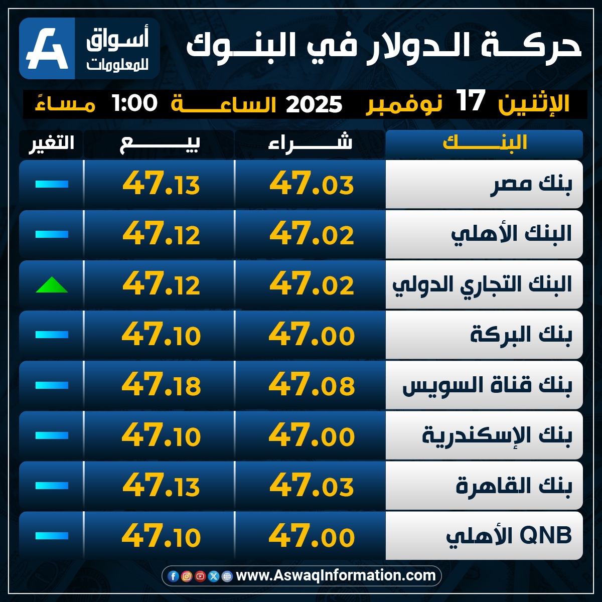 بينما ارتفع سعر الدولار في البنك التجاري الدولي مقابل الجنيه المصري عند 47.02 جنيه للشراء، ونحو 47.12 جنيه للبيع.