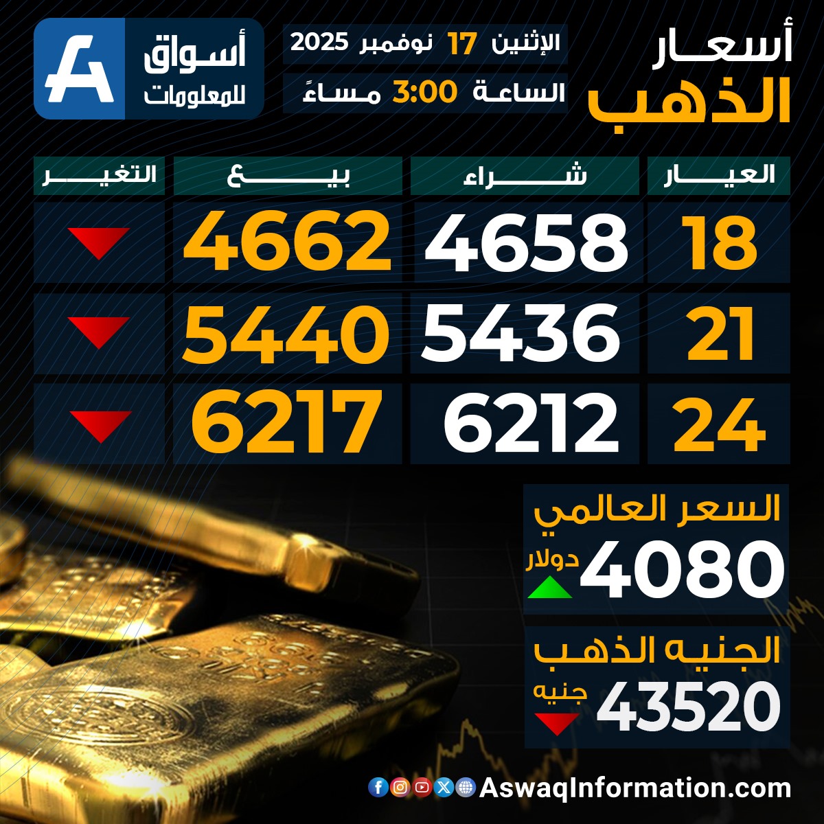 سعر الذهب في مصر الإثنين 17 نوفمبر 2025