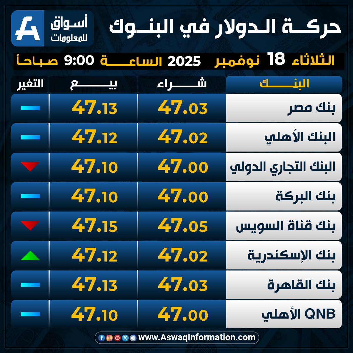 في حين ارتفع سعر الدولار في بنك الإسكندرية مقابل الجنيه المصري عند 47.02 جنيه للشراء، ونحو 47.12 جنيه للبيع.