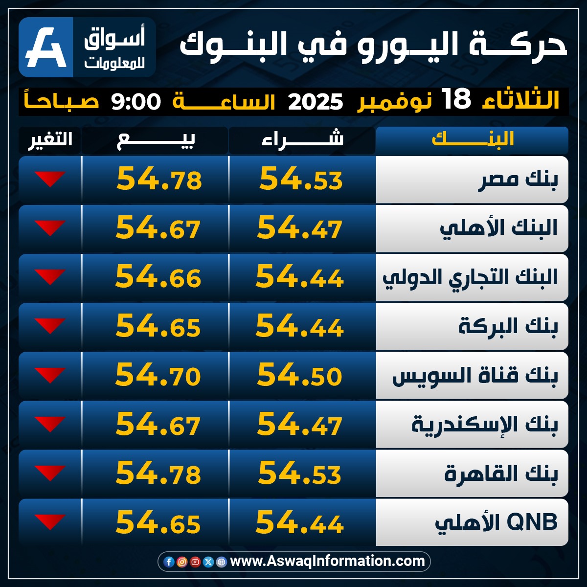 وانخفض سعر اليورو في البنك عند 54.44 جنيه للشراء، وسعر 54.65 جنيه للبيع