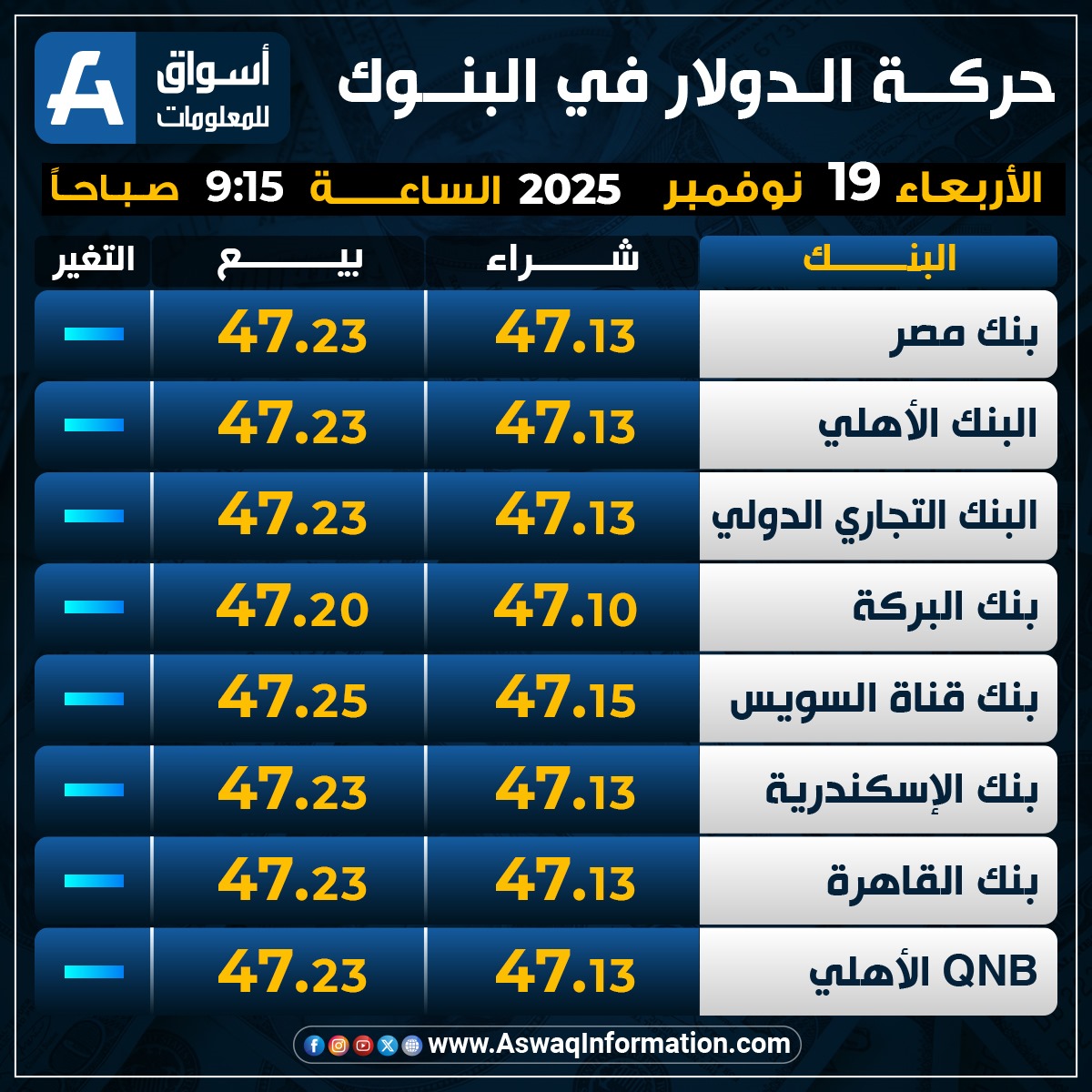 استقر سعر الدولار في بنك مصر مقابل الجنيه المصري عند 47.13 جنيه للشراء، ونحو 47.23 جنيه للبيع.