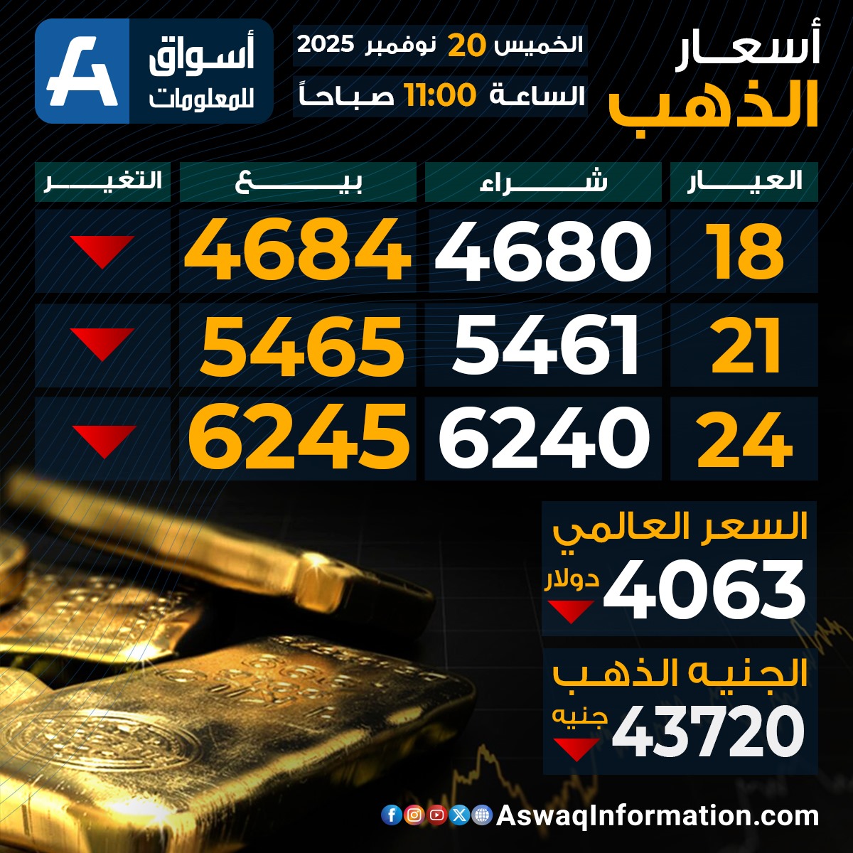 سجل سعر الجنيه الذهب اليوم الخميس 20 نوفمبر 2025 تراجعًا عند 43,720 جنيهًا ، قبل إضافة المصنعية والضريبة والدمغة.