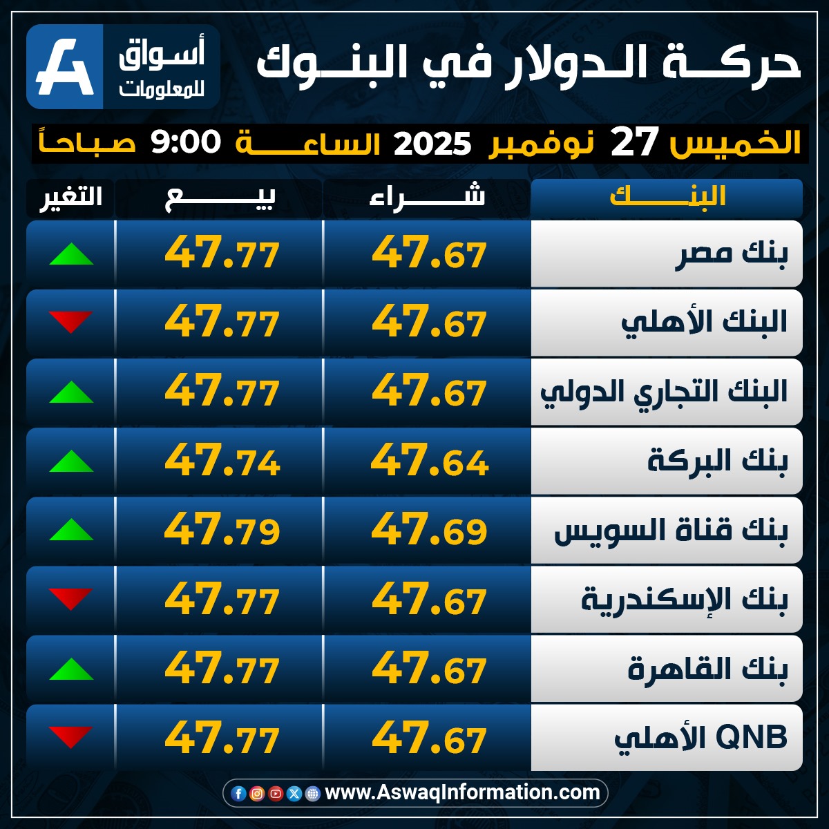 سعر الدولار اليوم.. ننشر لكم التفاصيل التي طرأت على العملة الخضراء التي شهدت تباينًا بمستهل تعاملات اليوم الخميس 27 نوفمبر 2025 مقابل الجنيه، وذلك بحسب شاشات التداول المعلنة بالبنوك الحكومية والخاصة العاملة داخل السوق المصرفية.