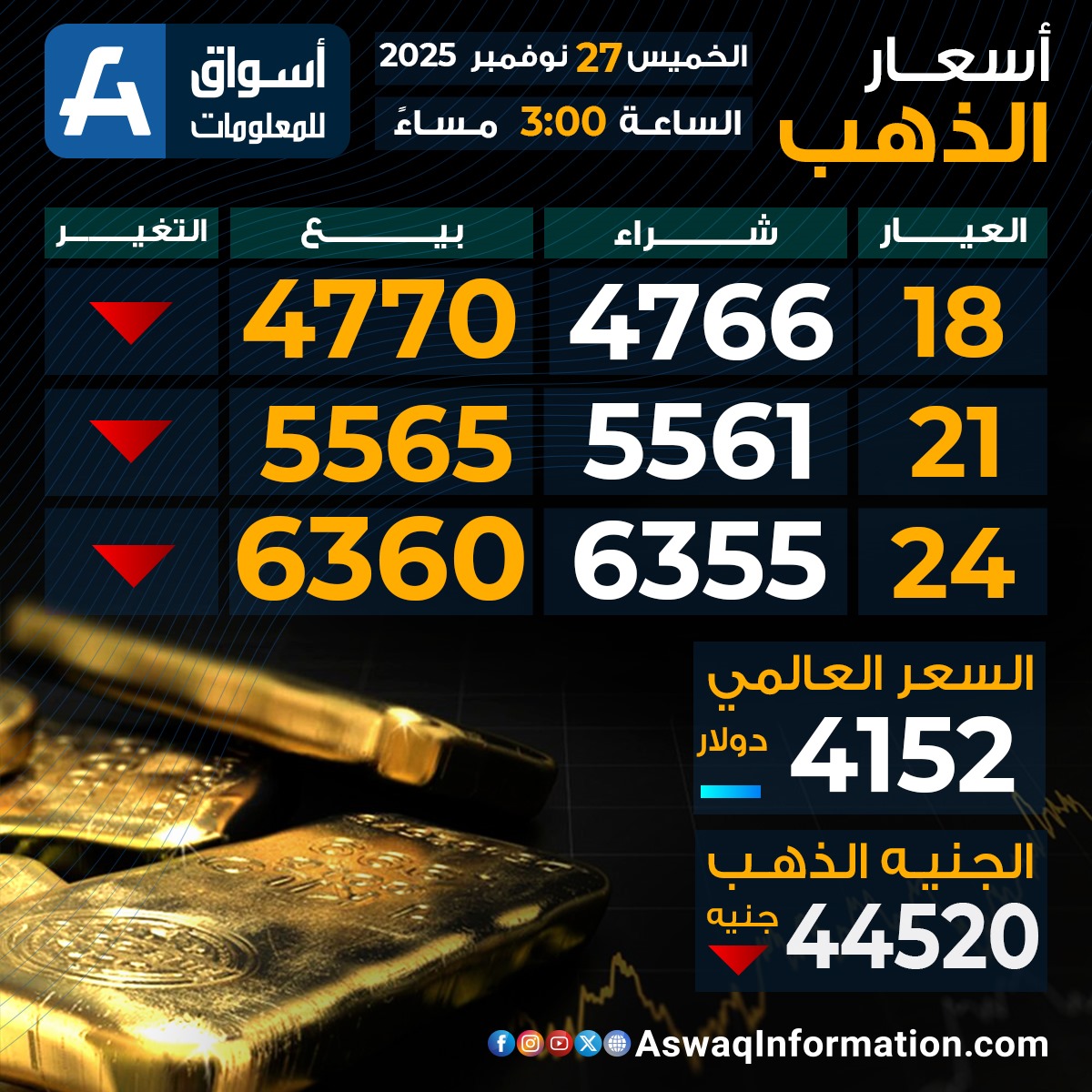 سجل سعر الجنيه الذهب اليوم الخميس 27 نوفمبر 2025 تراجعًا عند 44,520 جنيهًا ، قبل إضافة المصنعية والضريبة والدمغة.