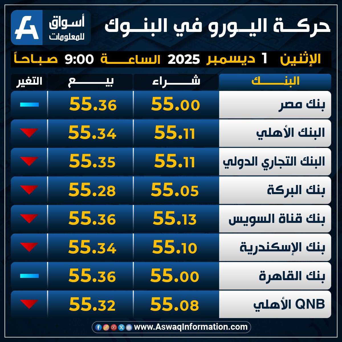 ونزل سعر اليورو في البنك عند 55.05 جنيه للشراء، وسعر 55.28 جنيه للبيع