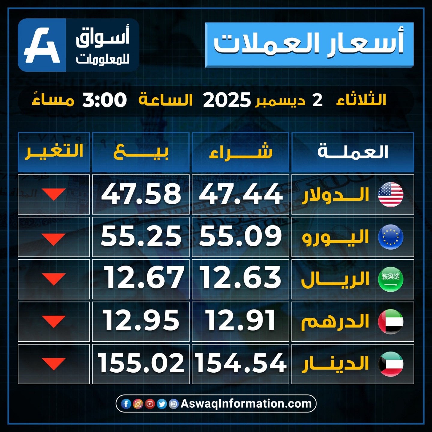 خيم التراجع على أسعار العملات اليوم الثلاثاء 2 ديسمبر 2025، مقابل الجنيه في نهاية التعاملات.