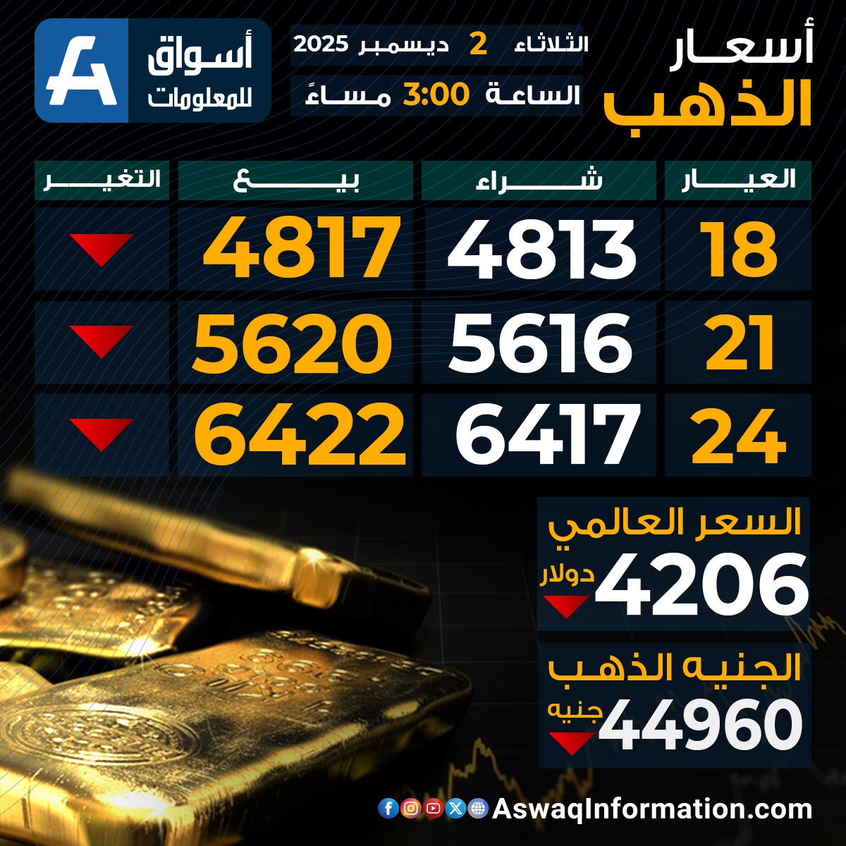 سعر الذهب في مصر الثلاثاء 2 ديسمبر 2025