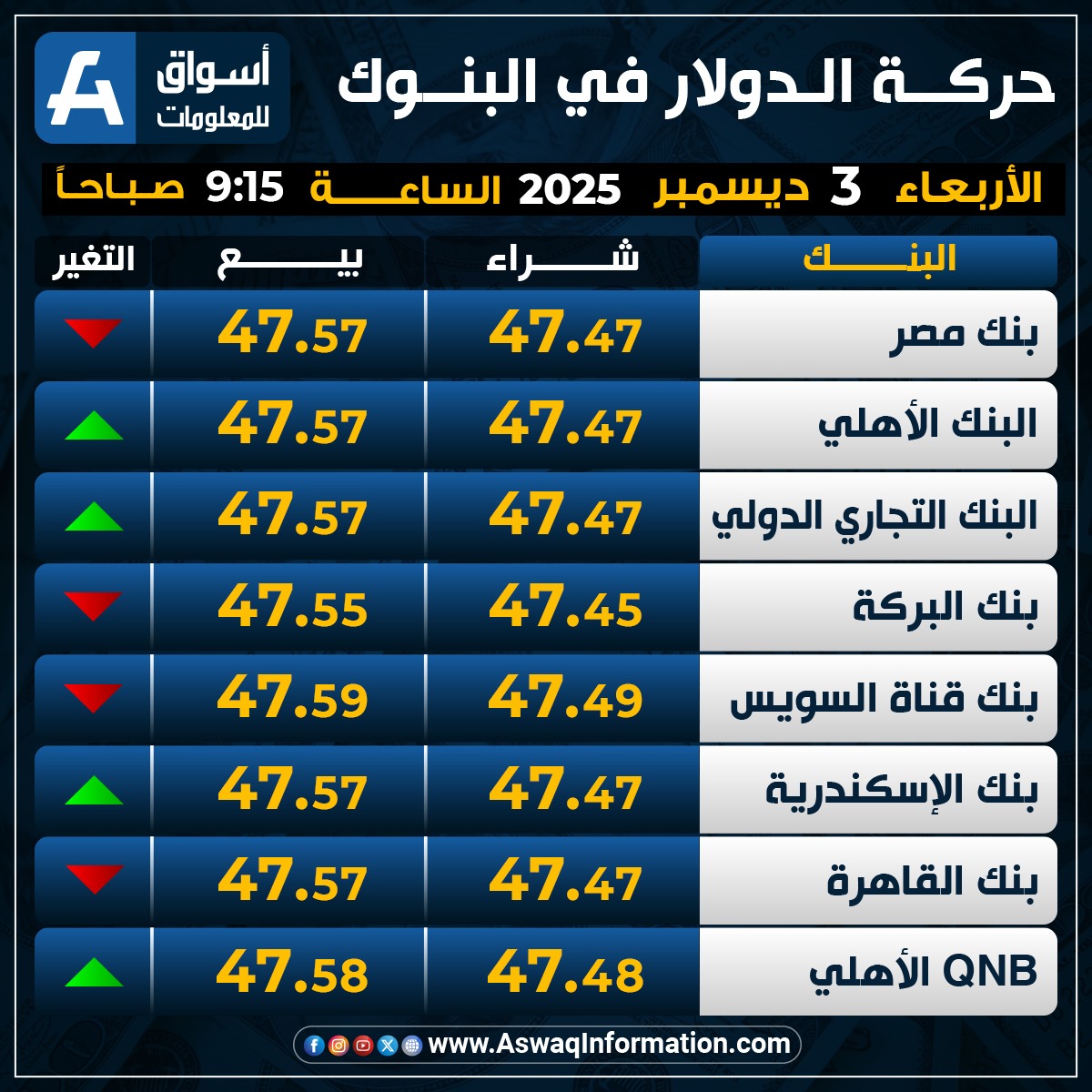 بينما ارتفع سعر الدولار في البنك الأهلي المصري مقابل الجنيه المصري عند 47.47 جنيه للشراء، ونحو 47.57 جنيه للبيع.