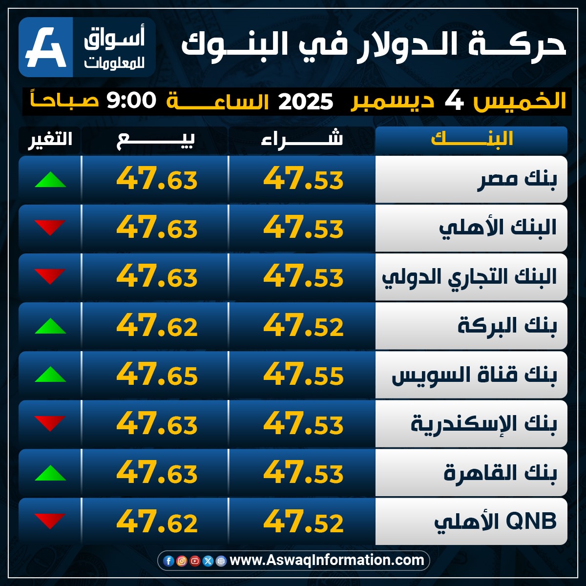 ارتفع سعر الدولار في بنك مصر مقابل الجنيه المصري عند 47.53 جنيه للشراء، ونحو 47.63 جنيه للبيع.