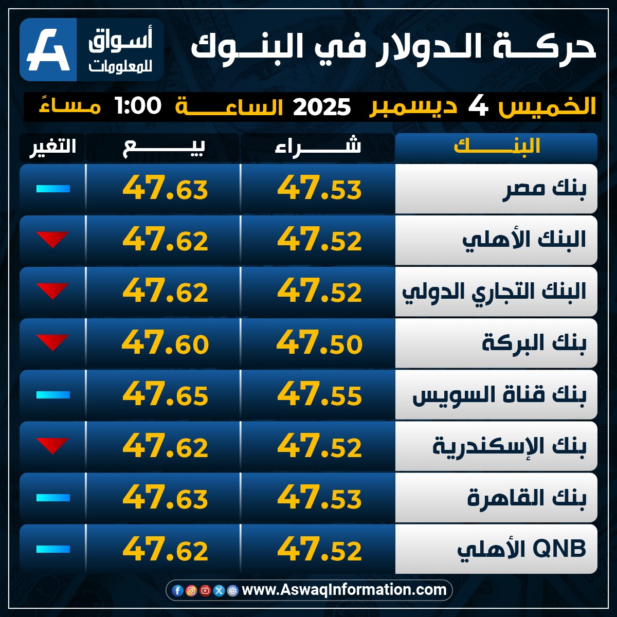 سعر الدولار اليوم.. ننشر لكم التفاصيل التي طرأت على العملة الخضراء التي شهدت تباينا بمنتصف تعاملات اليوم الخميس 4 ديسمبر 2025 مقابل الجنيه، وذلك بحسب شاشات التداول المعلنة بالبنوك الحكومية والخاصة العاملة داخل السوق المصرفية.