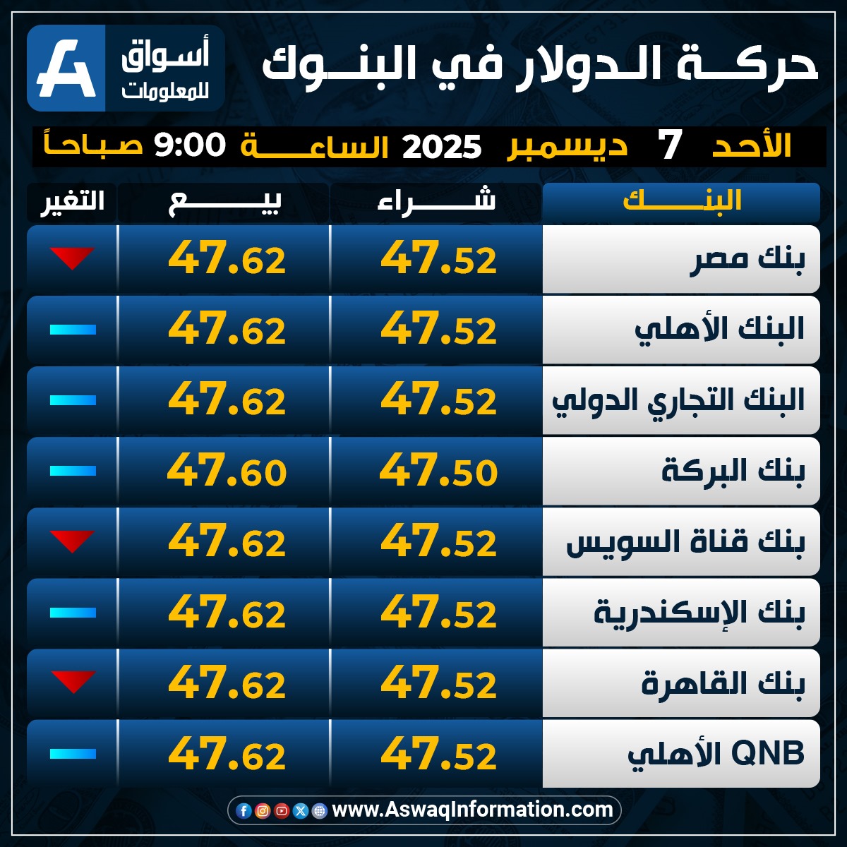 بينما ثبت سعر الدولار في البنك الأهلي المصري مقابل الجنيه المصري عند 47.52 جنيه للشراء، ونحو 47.62 جنيه للبيع.